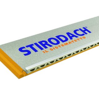 Sistema costituito da una lastra termoisolante di polistirene espanso estruso con rivestimento all’estradosso di una membrana in alluminio goffrato basso-emissivo con profilo metallico portategola.